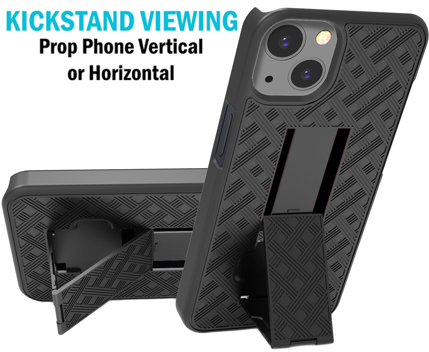 CASE KICKSTAND: Back of the case features built-in kickstand. Unsnap the hinge then slide downward until the kickstand snaps into place. Now you can prop your phone in vertical/horizontal positions. Horizontal is ideal for watching movies and videos. Vertical is handy for those "face-to-face" handsfree video calls.
