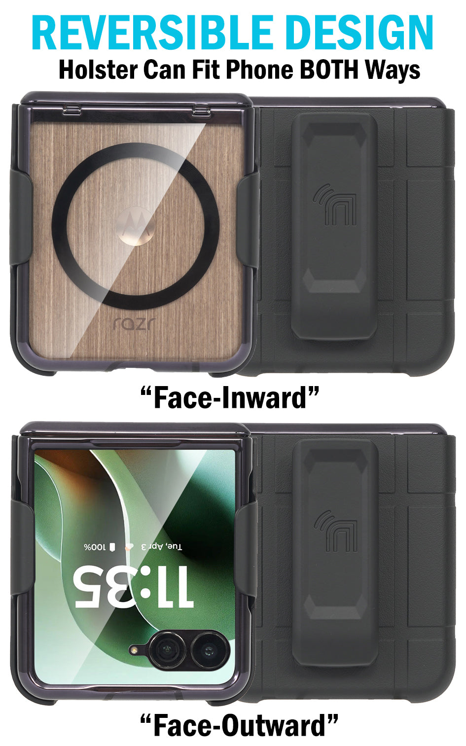REVERSIBLE: The holster can fit the phone both ways. Holds phone "face-out" for viewing. Insert phone "face-inward" so your screen is concealed and protected.