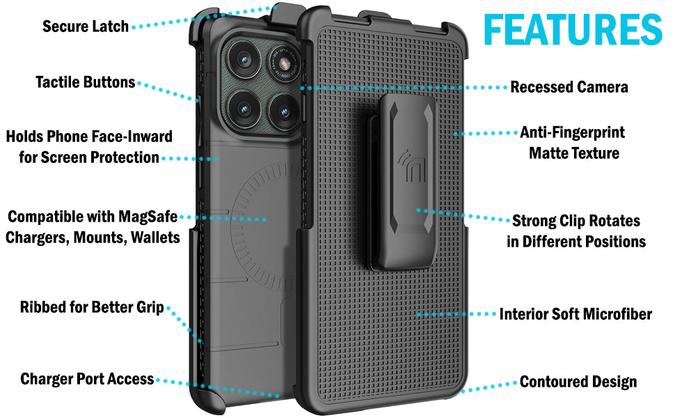 This is a case + holster combo made specifically for the Motorola Edge 2025 phone. The tough and flexible phone case provides impact protection, grip, shock absorption, (and best of all) features MagSafe Compatibility. Attach the clip to your side whenever you desire quick/convenient access.