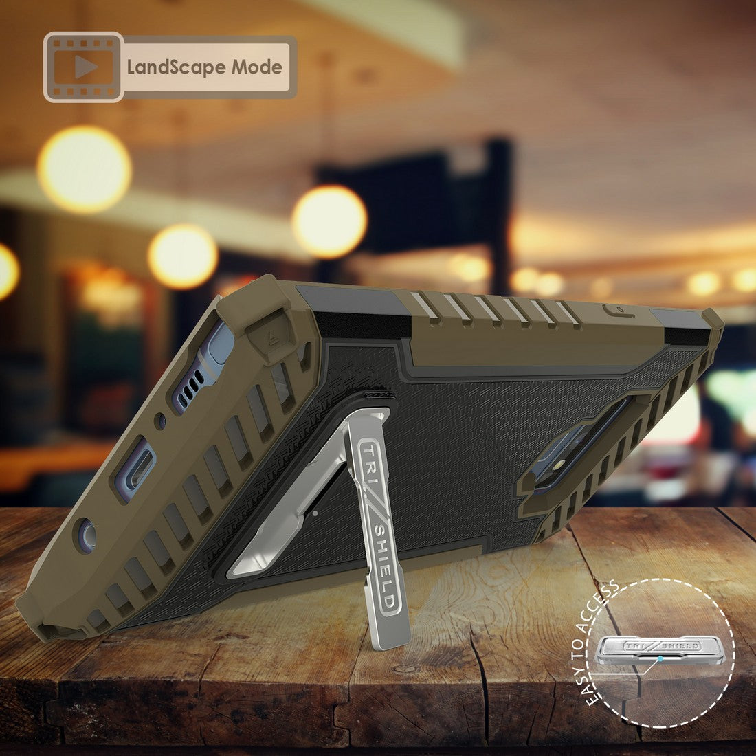The Tri-Shield Case provides kickstand viewing, drop protection, enhanced grip and one-of-a-kind design.