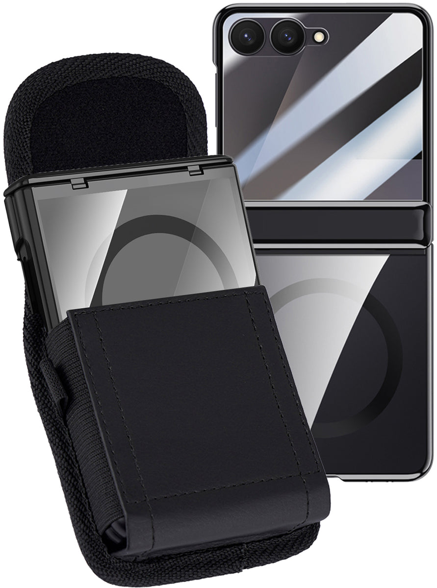 • POUCH HOLDER: Carry and Conceal Your Phone in the Black Vegan Leather Pouch. Features Metal Clip or Thread Belt Thru the Back of the Pouch. Soft Microfiber Interior Keeps Your Z Flip7 Cozy and Magnetic Closure for Quick Access. Keeps Your Device Secure at Close Range