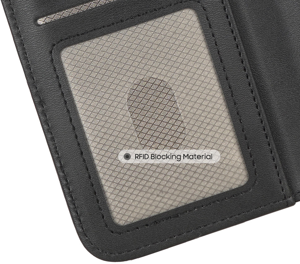 RFID SIX-CARD STORAGE: Black vegan leather wallet features three (3) card slots on the interior left side. Each slot can hold 2 cards and equipped with RFID protection. Behind the left panel you’ll see one full-length slot for cash. Now you can carry all the essentials: phone, credit cards, business cards, ID, license, club cards, cash, etc. Everything you need in one place! Side magnetic flap will keep the case closed shut.