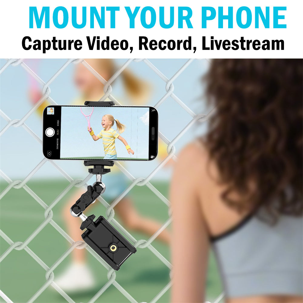 #1 FENCE MOUNT: The spring tension clip allows you to quickly install on chain link fence. The bracket is suitable for backstop metal fence commonly found at baseball parks, softball fields, tennis courts, etc. (basically any standard chain link fence). Includes cell phone holder. The spring tension mount fits virtually any cell phone, iPhone, etc. Use your phone to record or stream the game. The steel ball joint offers 360 rotation and tilt. Adjust to your perfect angle/orientation then tighten the wingnut to lock in place. Both ends of the mount feature standard .25 inch screw. Therefore this is compatible with other camera devices such as Mevo Start, Go Pro, Digital Camera, etc. Record the game with a stable and secure rig. The fence mount is easy to install and remove. Compact design for portability. If you are looking for something quick and simple, this is an ideal solution.